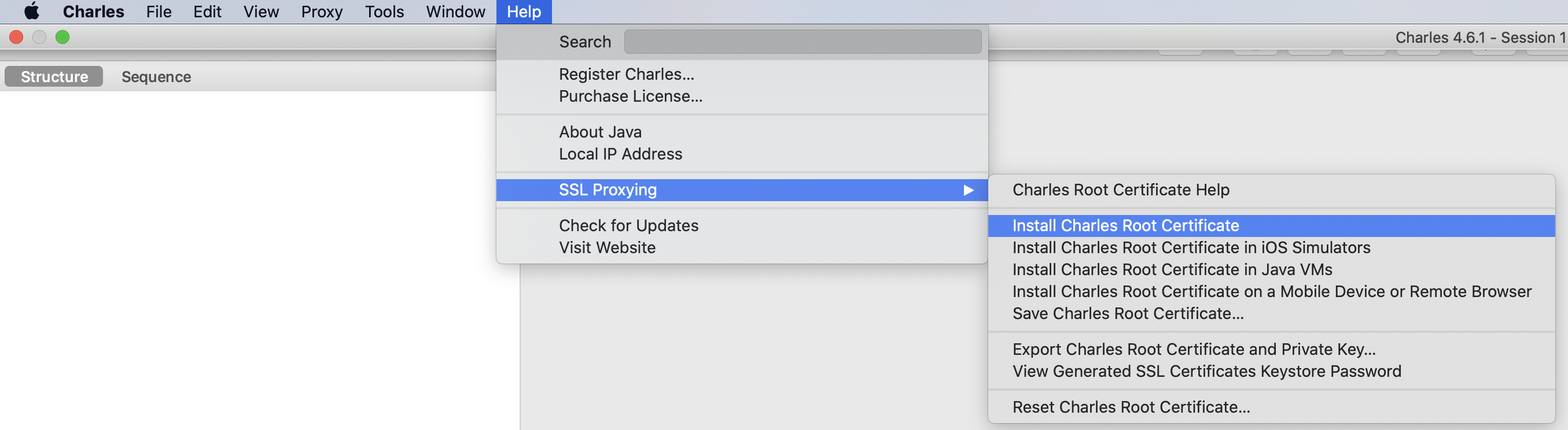 Help > SSL Proxying > Install Charles Root Certificate 에서 인증서를 설치한다.