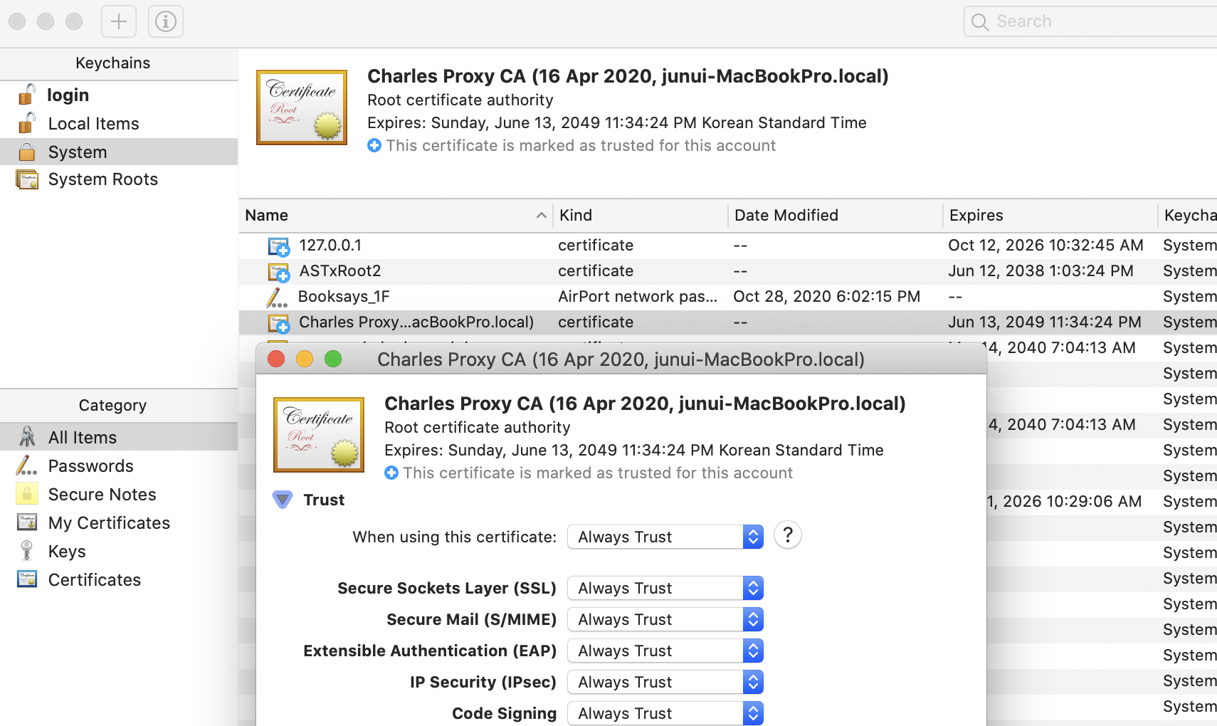 Charles가 Mac의 HTTPS 통신 주체가 되기 떄문에 Charles의 인증서를 신뢰해야한다.