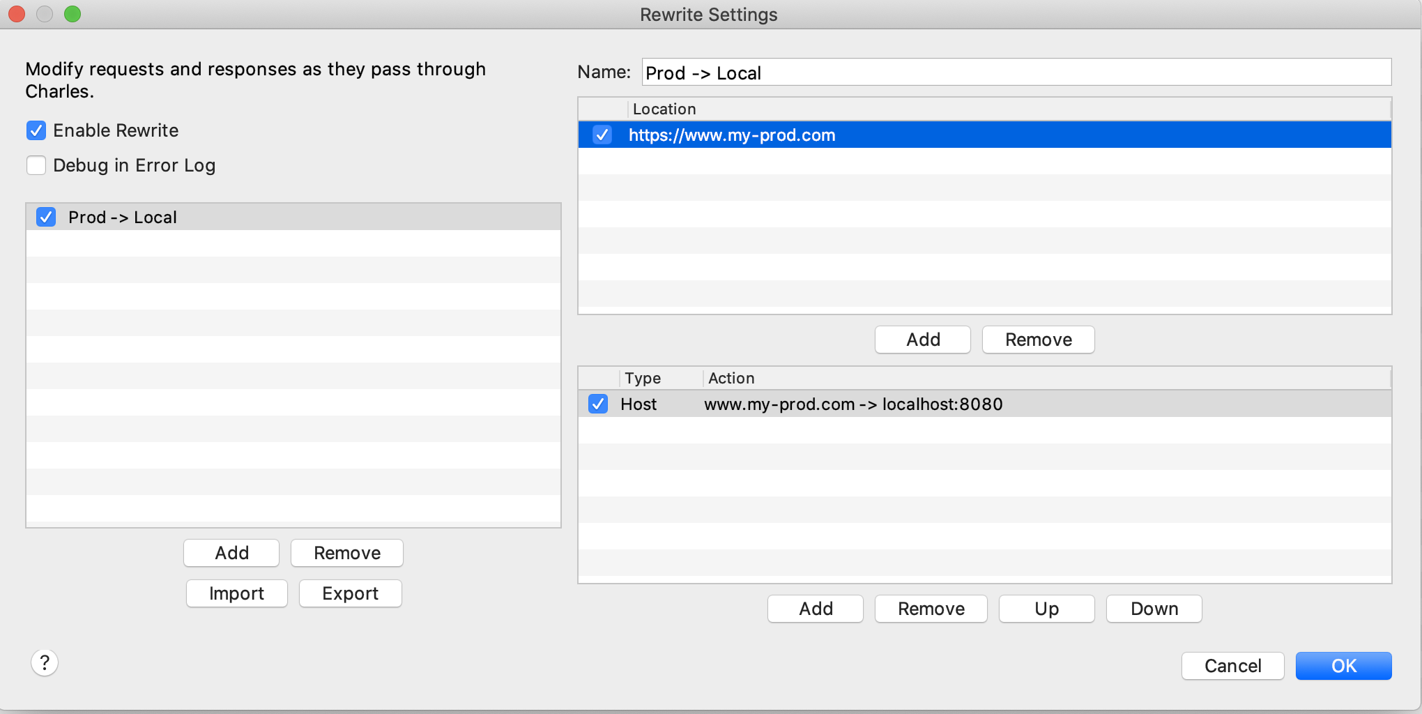 Charles에서 Toos > Rewrite에서 설정을 통해 요청을 변경 할 수 있다.